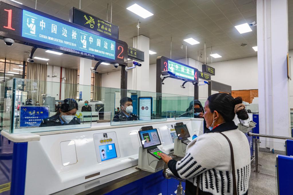 4月1日,移民管理警察在吉隆口岸驗(yàn)放入境旅客。新華社發(fā)(肖富貴 攝)