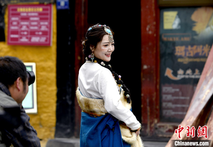 5月19日,游客身著民族特色的服裝在拉薩八廓街拍照留念。5月的拉薩初夏,草木漸茂、綠樹成蔭,雨量充沛、濕度適宜,日光充盈卻少了一絲燥熱,成為了眾多游客選擇進(jìn)藏的最佳時節(jié)。 中新社記者 李林 攝