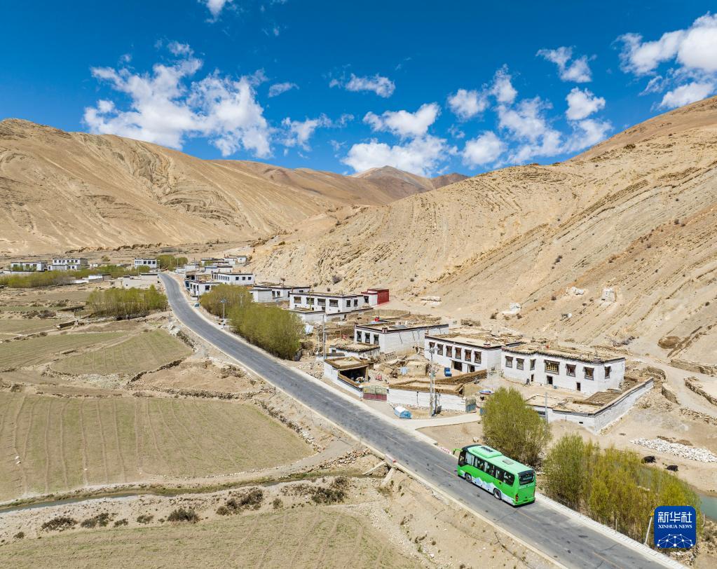 一輛載有游客的環(huán)保大巴車正駛向珠峰(5月25日攝,無(wú)人機(jī)照片)。新華社記者 孫非 攝