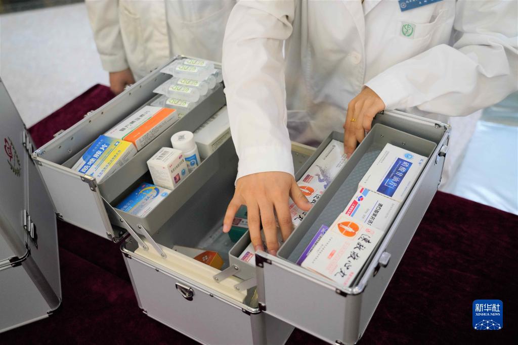 5月26日,北京高原適應研究康復中心的醫(yī)護人員在介紹隨車醫(yī)藥箱。新華社發(fā)(王靜頤攝)