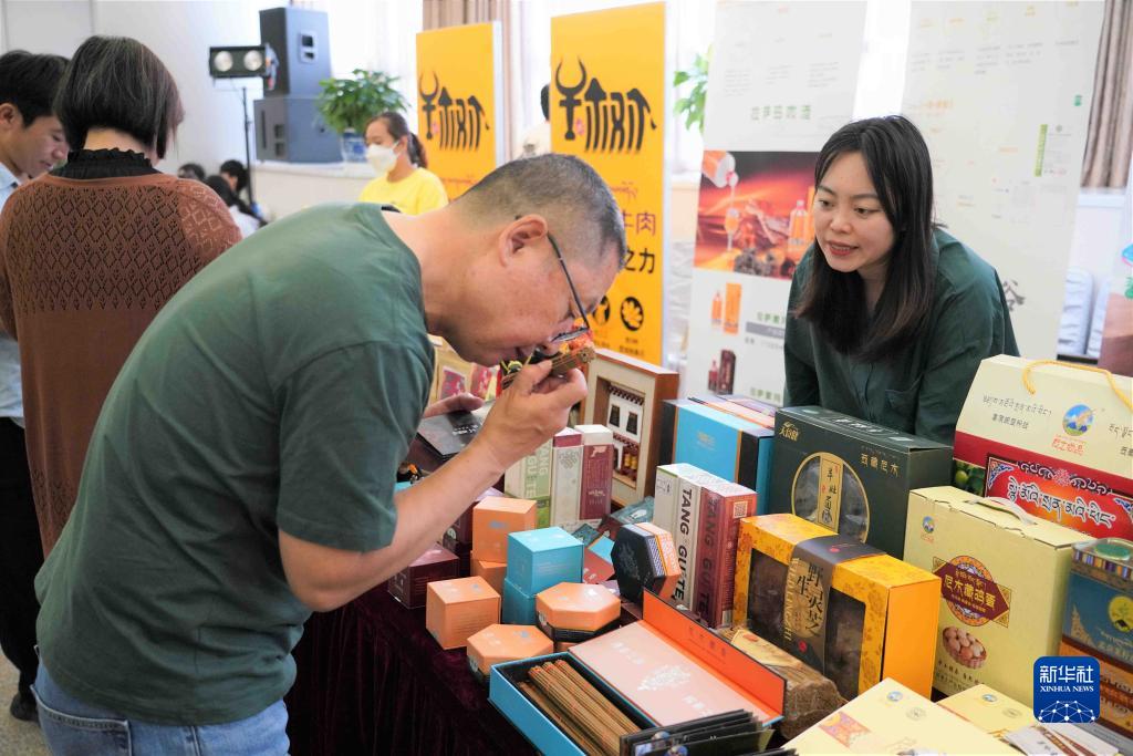 5月26日,推介會現(xiàn)場的工作人員為參觀者介紹西藏特色產(chǎn)品。新華社發(fā)(王靜頤攝)