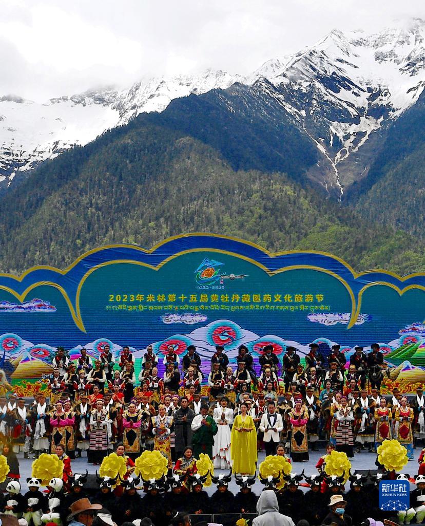 5月28日,演員在米林市第十五屆黃牡丹藏醫(yī)藥文化旅游節(jié)開幕式上表演節(jié)目。新華社記者 張汝鋒 攝