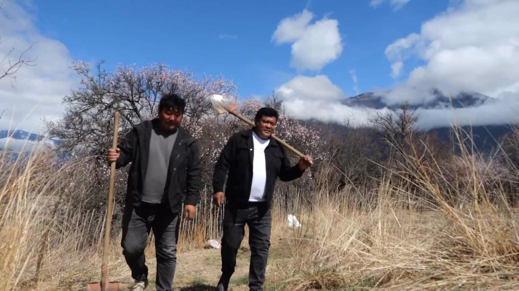 早春,雪域高原逐漸從寒冬中復蘇。西藏林芝的山林之中,桃花如云霞般綻放。一片芳菲景象中,新一年的生機與繁榮正在孕育。這天一早,羌渡崗村的兩名干部又一次來到了他們牽掛的村集體果園,查看長勢,整理土地。