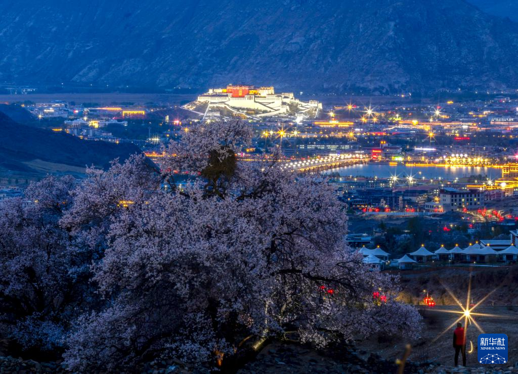 夜色中桃花映襯著布達拉宮(4月16日攝)。新華社記者 姜帆 攝