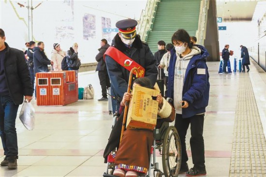 圖為拉薩車站“天路格桑花”青年志愿服務(wù)隊(duì)工作人員為旅客服務(wù)。 孫皓 記者 丹增群培 攝