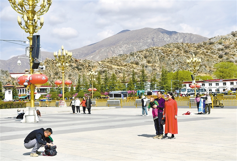 在布達(dá)拉宮廣場(chǎng)合影的游客。記者 王敏 攝