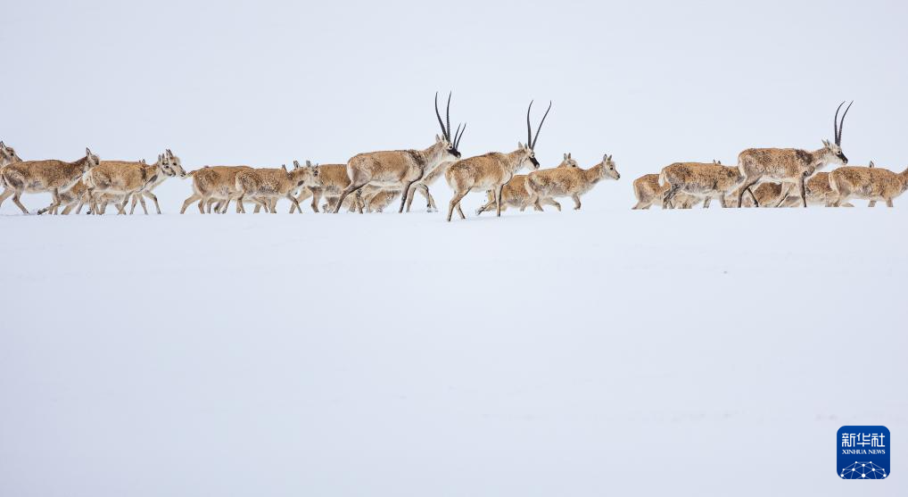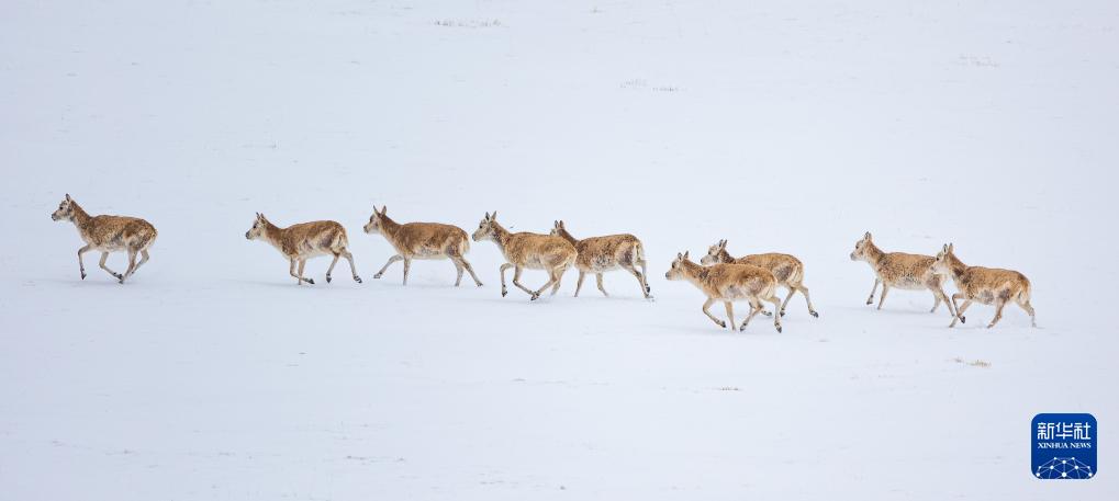 藏羚羊在雪地上奔跑(5月8日攝)。新華社記者 姜帆 攝