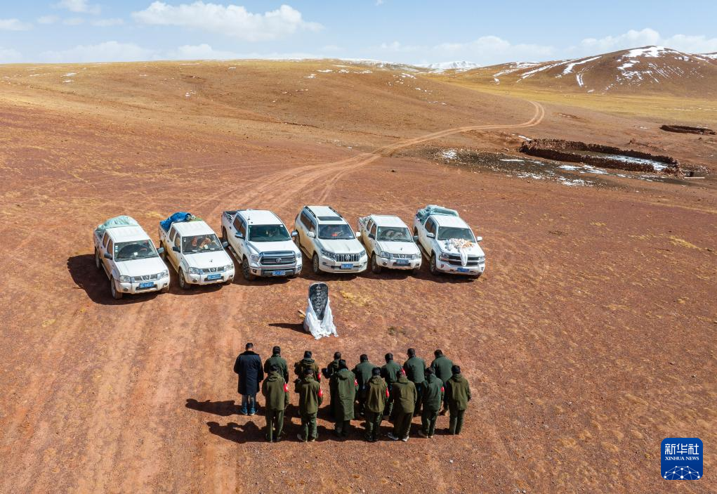 野生動(dòng)物專業(yè)管護(hù)隊(duì)員在無(wú)人區(qū)深處的羅布玉杰烈士紀(jì)念碑前默哀致敬。羅布玉杰2002年在與盜獵分子的槍戰(zhàn)中犧牲(無(wú)人機(jī)照片,5月10日攝)。新華社記者 姜帆 攝