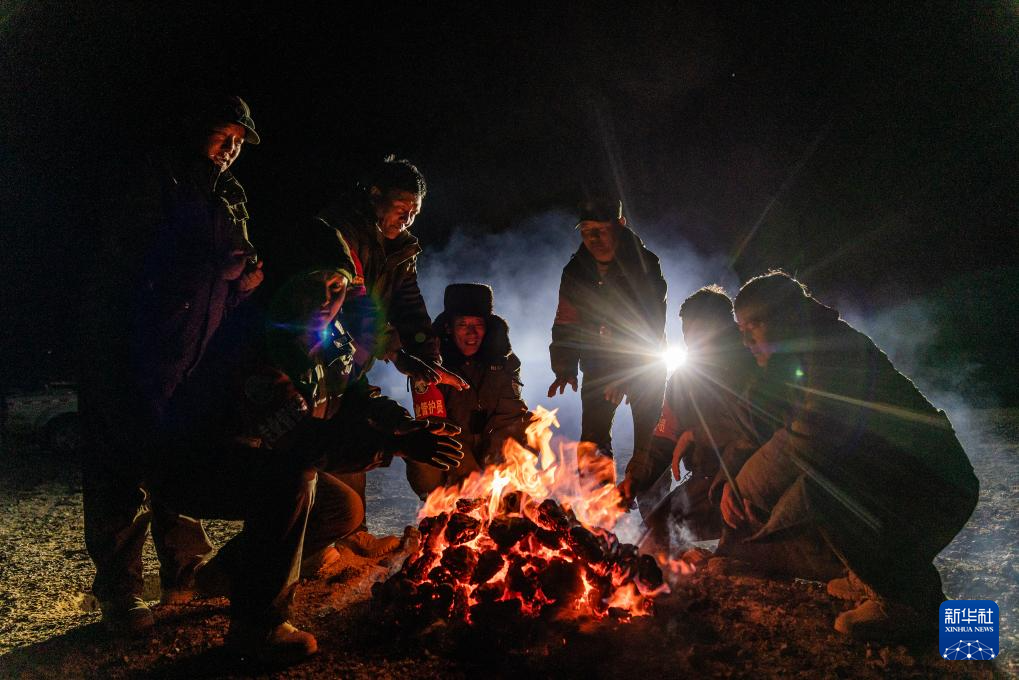 野生動(dòng)物專業(yè)管護(hù)隊(duì)員在宿營(yíng)地里烤火,燃料是野牦牛的糞便(5月10日攝)。新華社記者 丁增尼達(dá) 攝 ??