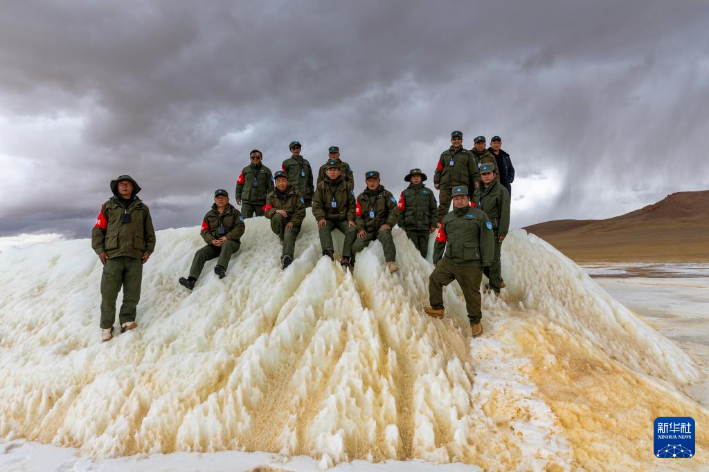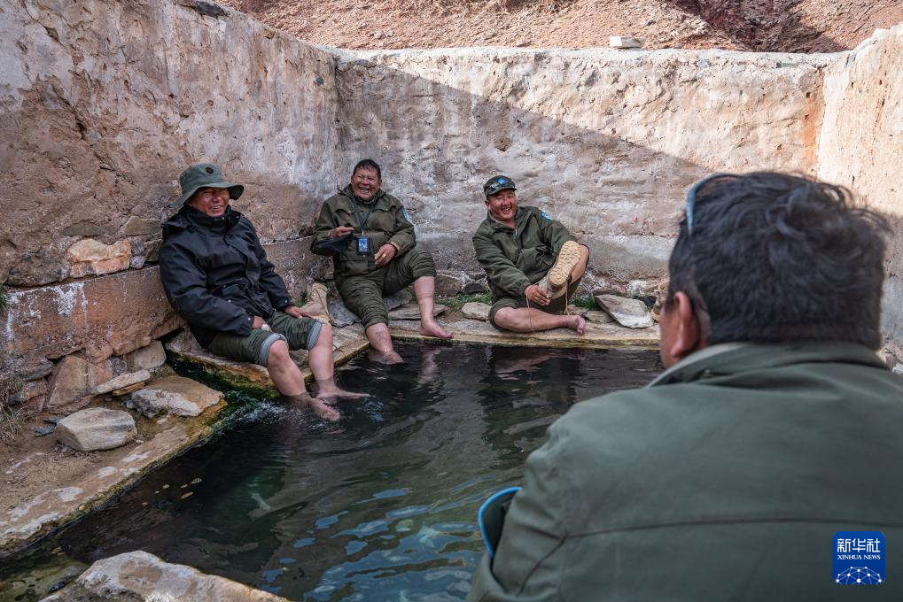 ??野生動(dòng)物專業(yè)管護(hù)隊(duì)員們?cè)谝惶帍U棄的溫泉池中泡腳休息(5月8日攝)。新華社記者 丁增尼達(dá) 攝