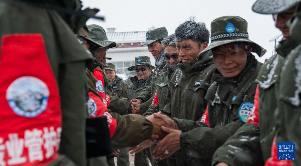 布查玉管護(hù)站的野生動(dòng)物管護(hù)隊(duì)員們熱情歡迎風(fēng)雪中前來(lái)巡護(hù)的同事(5月7日攝)。新華社記者 丁增尼達(dá) 攝 ??
