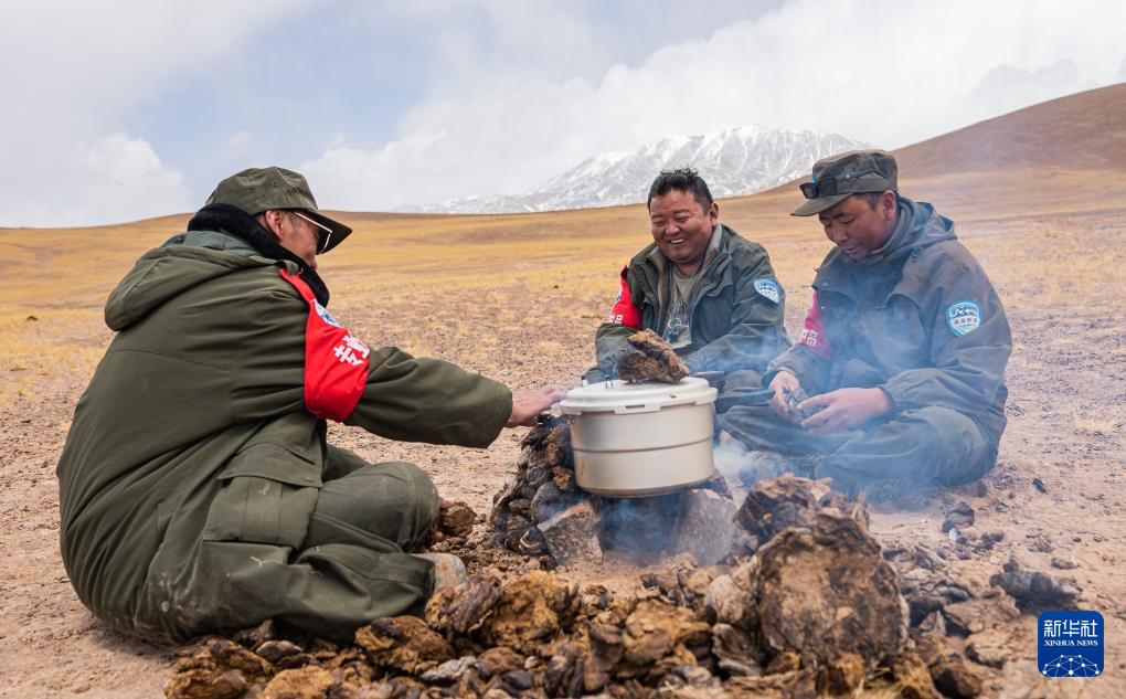 ??野生動(dòng)物專業(yè)管護(hù)隊(duì)員在巡護(hù)途中就地取材,用野牦牛糞生火做飯(5月10日攝)。新華社記者 丁增尼達(dá) 攝