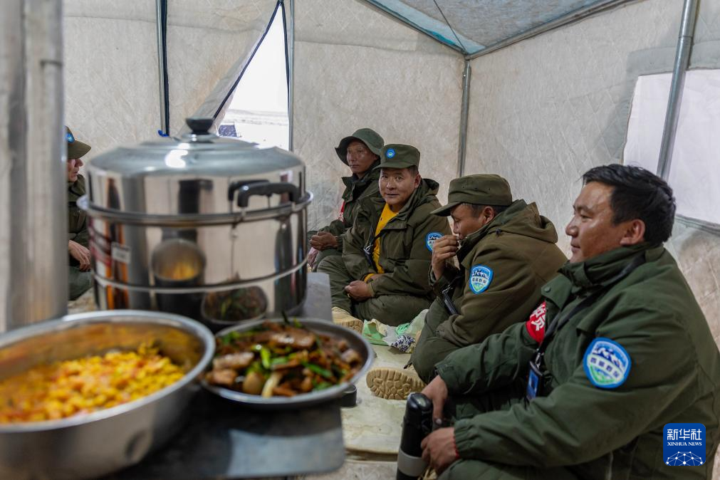 ??野生動(dòng)物專業(yè)管護(hù)隊(duì)員們?cè)谒逘I(yíng)的帳篷中準(zhǔn)備吃飯(5月7日攝)。新華社記者 姜帆 攝