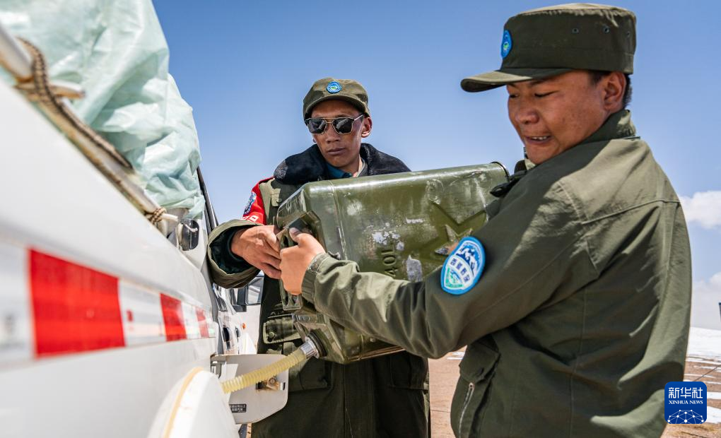 ??野生動(dòng)物專業(yè)管護(hù)隊(duì)員在巡護(hù)途中給車輛加油(5月9日攝)。新華社記者 丁增尼達(dá) 攝