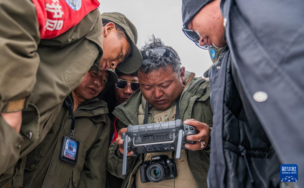 ??羅布玉杰管護(hù)站站長(zhǎng)格桑倫珠(右二)和隊(duì)員們?cè)诖笱┲胁僮鳠o(wú)人機(jī)觀察藏羚羊遷徙情況(5月10日攝)。新華社記者 丁增尼達(dá) 攝