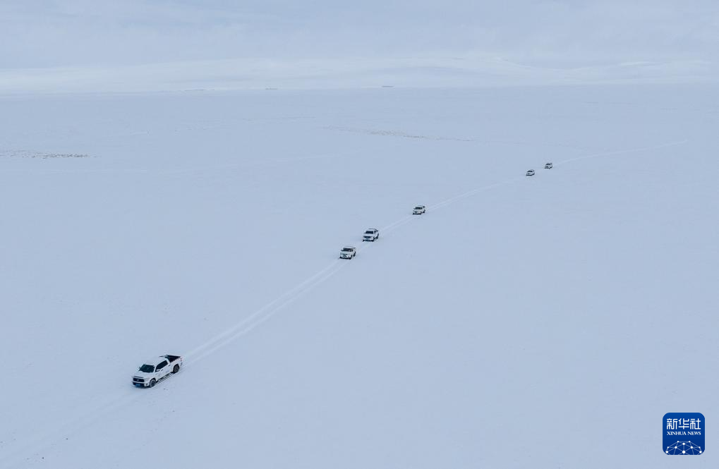 ??野生動(dòng)物專業(yè)管護(hù)隊(duì)員的車隊(duì)在大雪中巡護(hù)(無(wú)人機(jī)照片,5月8日攝)。新華社記者 丁增尼達(dá) 攝