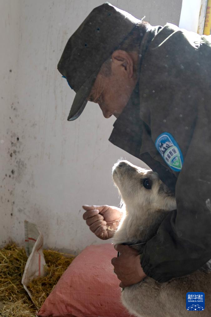 ??羅布玉杰站的野生動(dòng)物專業(yè)管護(hù)隊(duì)員在出發(fā)巡護(hù)前給站里救護(hù)的受傷藏原羚喂糌粑(5月7日攝)。新華社記者 姜帆 攝