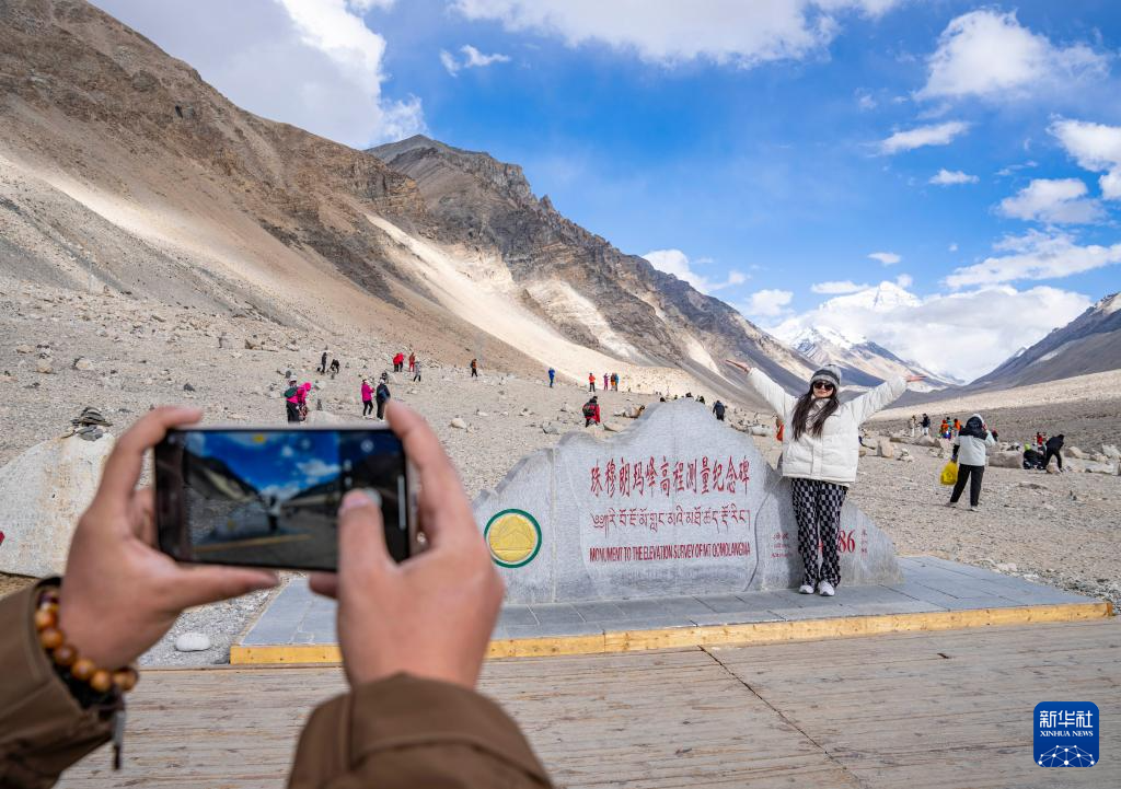 游客在珠穆朗瑪峰高程測(cè)量紀(jì)念碑前拍照留念(5月24日攝)。新華社記者 孫非 攝