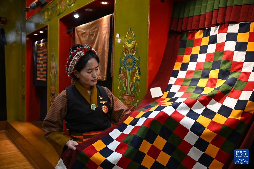 9月1日,在西藏日喀則市仁布縣特色產(chǎn)業(yè)孵化園,亞德細褐紡織手工藝傳承人南木珍查看展示的紡織品成品。新華社記者 孫瑞博 攝 ??