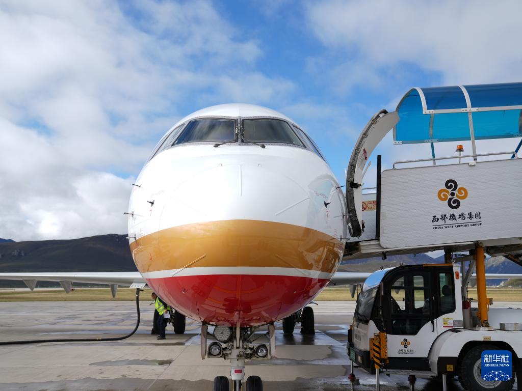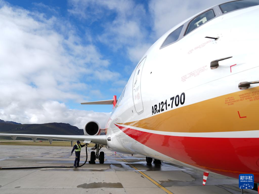 9月21日,在青海果洛瑪沁機場,工作人員在為國產(chǎn)商用飛機ARJ21加油。新華社記者 丁汀 攝