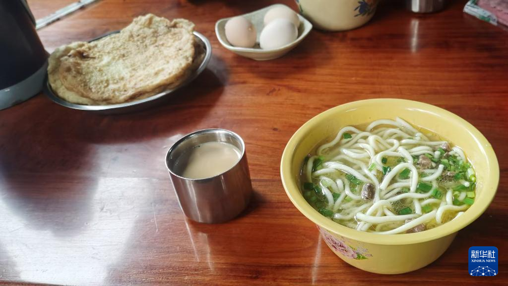 藏面的經(jīng)典套餐中還包括牛肉油餅、雞蛋和甜茶。新華社記者魏冠宇 攝