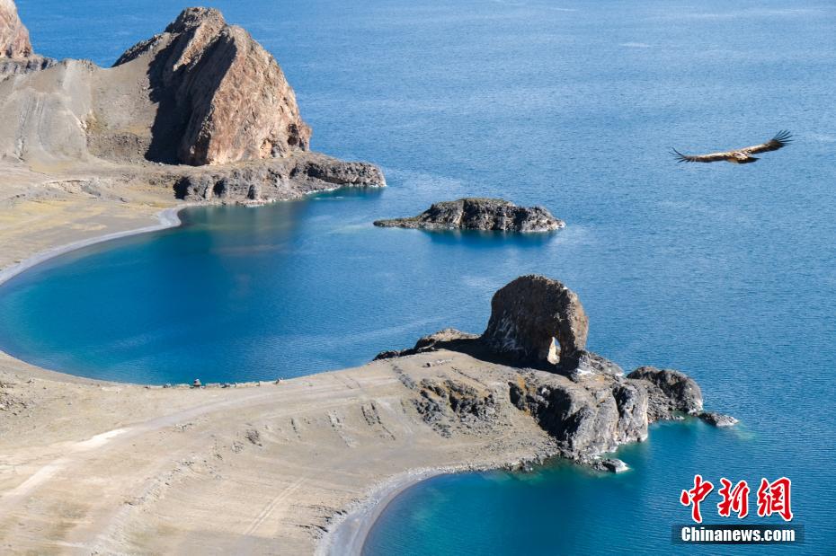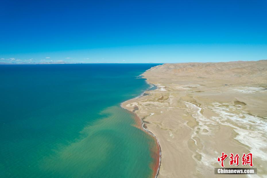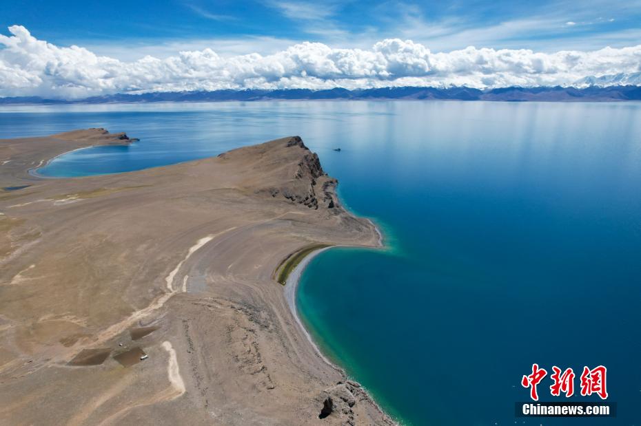 國(guó)慶期間,中新網(wǎng)記者自駕西藏藏北羌塘草原,途經(jīng)“天湖”納木錯(cuò),高原鹽湖班戈湖以及西藏第一大湖色林錯(cuò)等地。秋天高原藍(lán)天白云的映襯下,藏北湖泊猶如一面面巨大的“寶石藍(lán)”鏡子鑲嵌于高原大地,景色壯麗。圖為10月2日,航拍西藏第一大湖色林錯(cuò)北岸風(fēng)光。記者 江飛波 攝