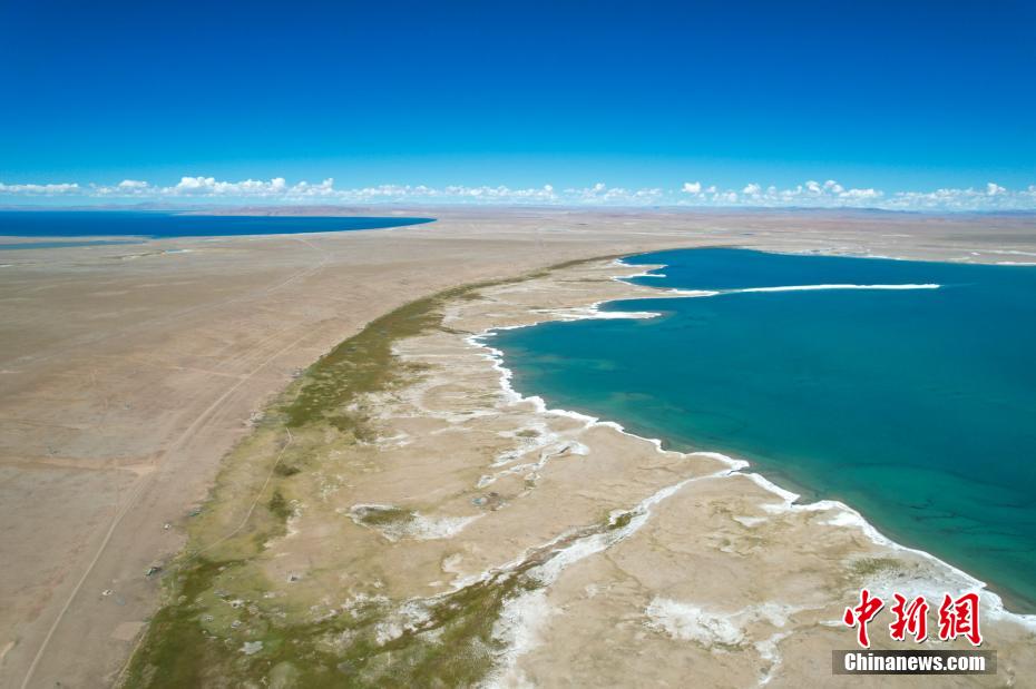 國(guó)慶期間,中新網(wǎng)記者自駕西藏藏北羌塘草原,途經(jīng)“天湖”納木錯(cuò),高原鹽湖班戈湖以及西藏第一大湖色林錯(cuò)等地。秋天高原藍(lán)天白云的映襯下,藏北湖泊猶如一面面巨大的“寶石藍(lán)”鏡子鑲嵌于高原大地,景色壯麗。圖為10月2日,西藏班戈縣班戈湖,畫(huà)面左上角為色林錯(cuò)。記者 江飛波 攝