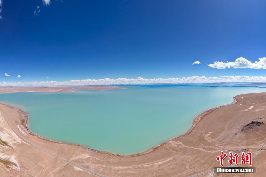國(guó)慶期間,中新網(wǎng)記者自駕西藏藏北羌塘草原,途經(jīng)“天湖”納木錯(cuò),高原鹽湖班戈湖以及西藏第一大湖色林錯(cuò)等地。秋天高原藍(lán)天白云的映襯下,藏北湖泊猶如一面面巨大的“寶石藍(lán)”鏡子鑲嵌于高原大地,景色壯麗。圖為10月4日,航拍西藏色林錯(cuò)水天相接。記者 江飛波 攝