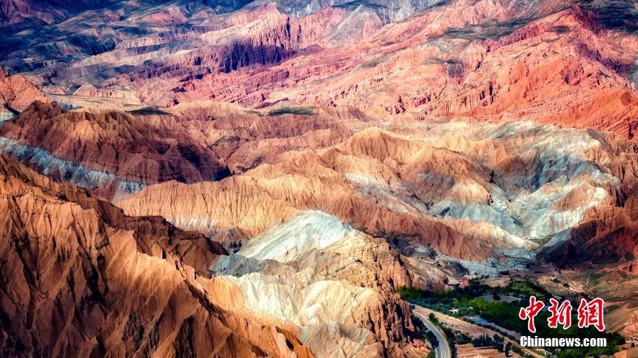 秋日高原,攝影愛好者在黃河上游的青海省海南藏族自治州貴德縣境內(nèi),航拍貴德國家地質(zhì)公園的阿什貢七彩峰叢地貌多姿多彩,秀麗壯美。畫面中,天高云淡,山巒起伏,黃河在山川中蜿蜒,阿什貢七彩峰叢色彩斑斕,與天空云彩的倒影形成了一幅壯美的山川社稷圖景。航拍圖為阿什貢七彩峰叢的丹霞地貌。(無人機照片)