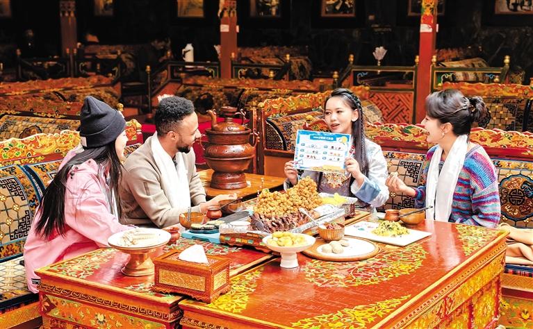 “在我們餐廳,經(jīng)常能看到不同民族、不同地方的人們同吃一道菜、共飲一壺茶的場(chǎng)景,大家其樂融融,就像一家人一樣?!辈惋嫹?wù)人員益西說。
