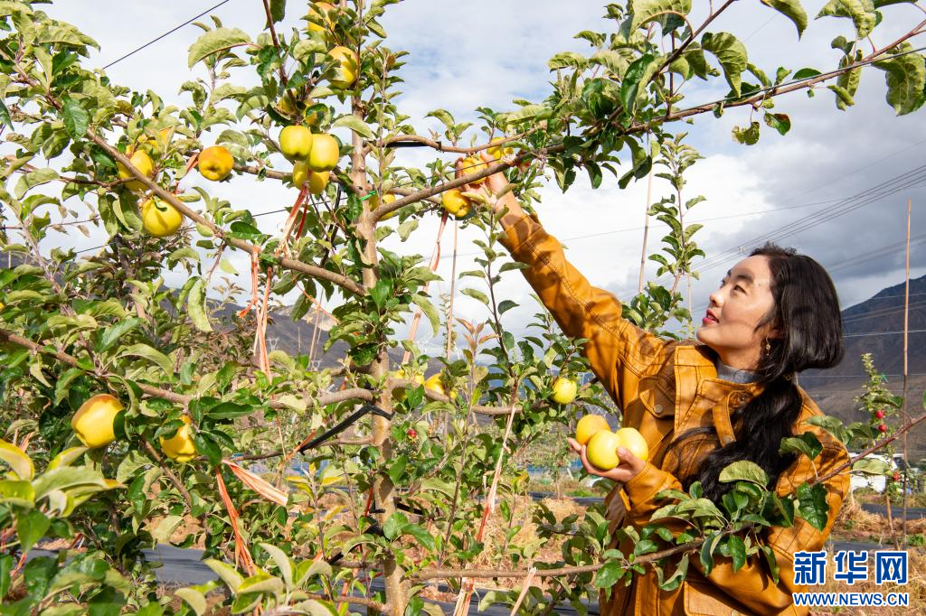 10月12日,西藏昌都市八宿縣白瑪鎮(zhèn)沙木村村民嘎桑曲珍在蘋(píng)果園區(qū)采摘。該園區(qū)于2023開(kāi)始陸續(xù)掛果,預(yù)計(jì)2025年進(jìn)入豐產(chǎn)期,今年園區(qū)蘋(píng)果產(chǎn)量達(dá)140余噸左右。目前全縣種植蘋(píng)果35萬(wàn)余株,總面積4848.95余畝。新華網(wǎng) 旦增努布 攝