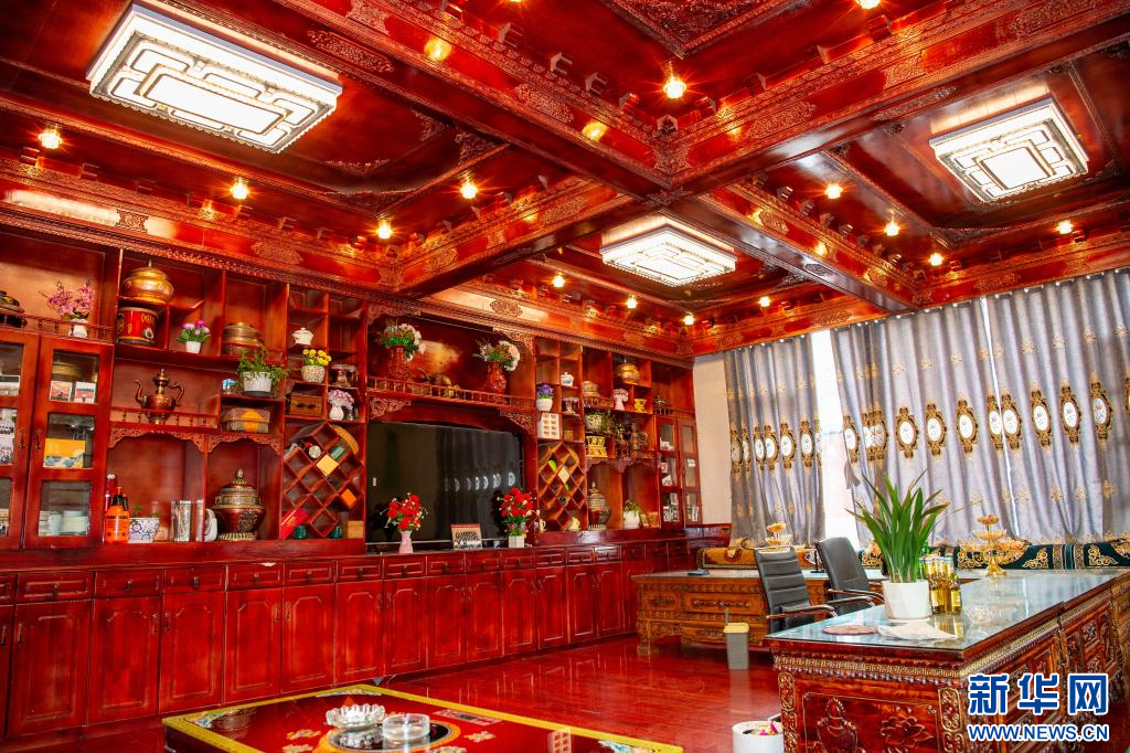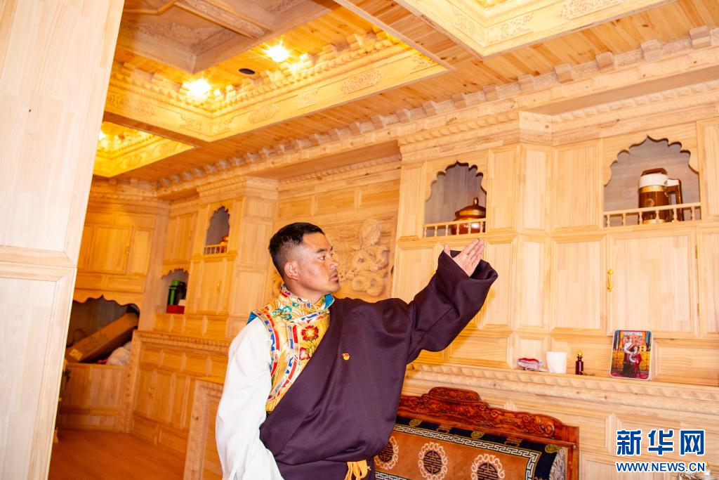 10月14日,昌都市左貢縣旺達鎮(zhèn)兵達村村民貢布普措在介紹自家裝飾。新華網(wǎng) 旦增努布 攝