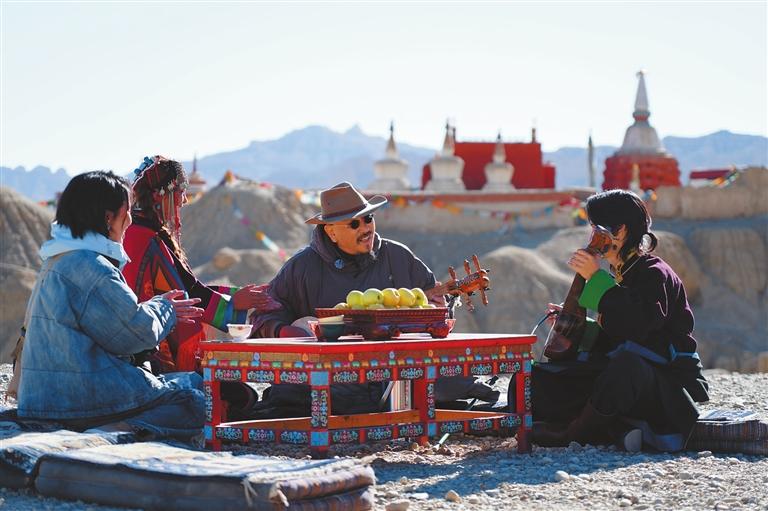 中阮演奏家馮滿天(左)與阿里青年音樂人格瑪扎西(右)在古格遺址腳下即興彈奏。本報記者 達(dá)珍 洛桑旦增 攝