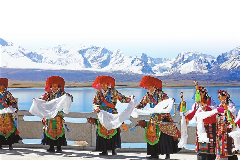 群眾在佩枯錯湖畔表演非遺歌舞乃龍甲諧。本報記者 旦增嘎瓦 攝