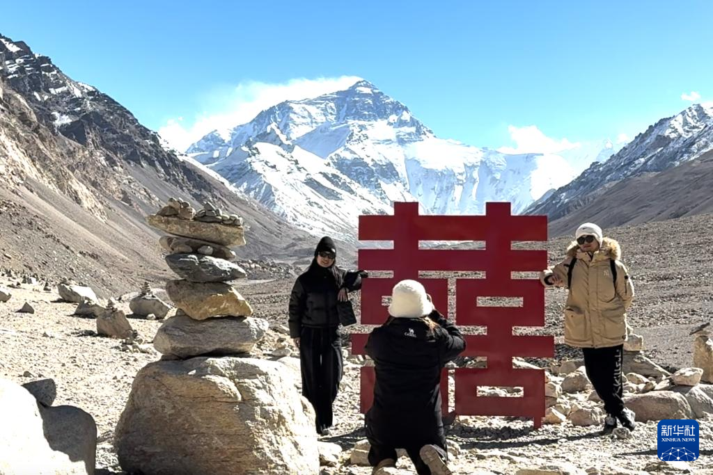 11月20日,游客在珠峰景區(qū)的“囍”字前拍照留影。新華社記者 邱星翔 攝 ??