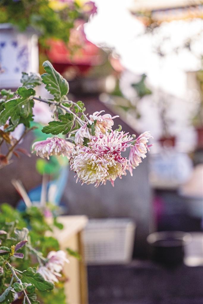 走進(jìn)八廓街、穿過繁華的大昭寺廣場,沿著古巷小路便能來到貢桑孜大院。邁入大院,首先映入眼簾的是獨(dú)具韻味的傳統(tǒng)藏式建筑風(fēng)格,白墻、紅頂、黑窗沿,陽光滲過在微風(fēng)中飄動(dòng)的“香布”,稀稀散散地落在精美的木雕窗花上,襯得陽臺木制立柱上的花紋分外醒目。各式花卉與居民生活用品一同擺放在四四方方的院落中,卻并不顯得擁擠,反而增添了一絲浪漫的煙火氣。