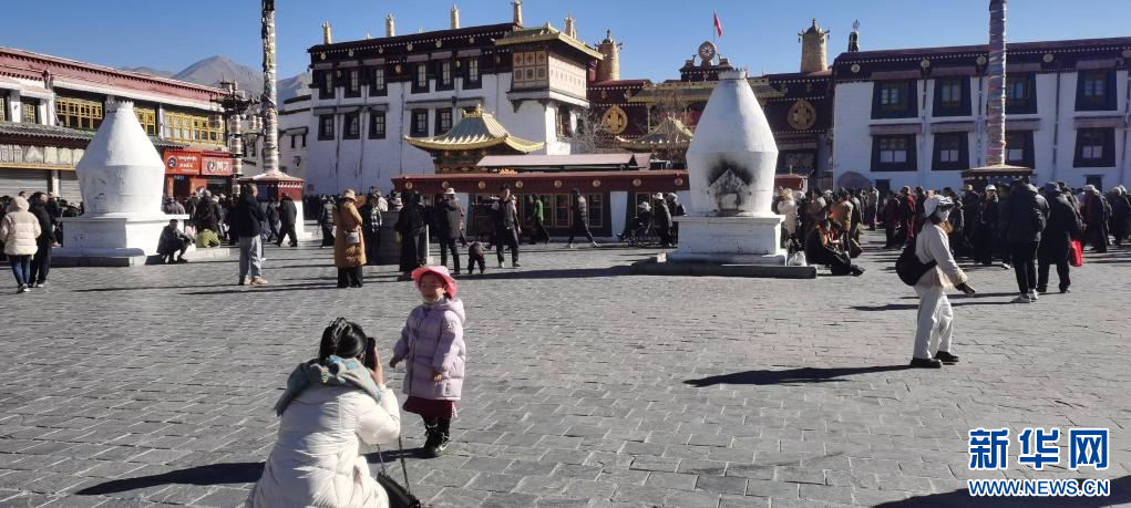 11月29日,游客在西藏拉薩大昭寺前留念,其身后的煨桑爐設有煙筒和鋼制攔火門。新華社記者魏冠宇 攝