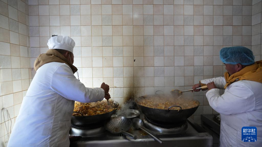 1月14日,服務(wù)隊的兩名廚師正在為村民們做午飯。新華社記者 邱星翔 攝