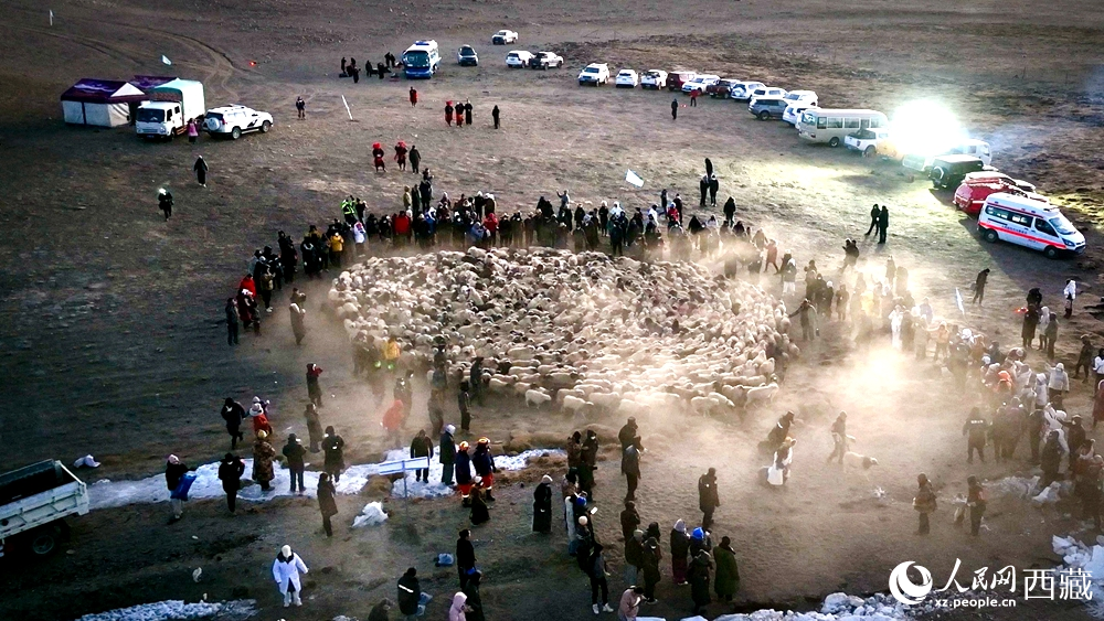 隨著一聲號令,牧民們驅(qū)趕著羊群,踏上冰封的湖面。遠遠望去,羊群如同一串串黑白相間的珍珠,在湛藍的冰面上緩緩移動,構(gòu)成一幅壯美的高原畫卷。
