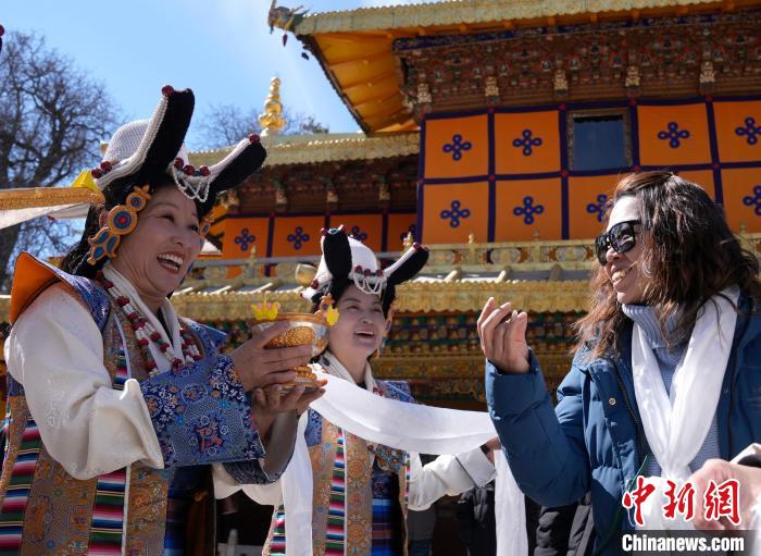 2月20日,由西藏自治區(qū)文化和旅游廳舉辦的2025年香港至拉薩航班首航旅行團(tuán)歡迎儀式在羅布林卡舉行。來(lái)自香港的游客將前往布達(dá)拉宮、大昭寺等地,開(kāi)啟冬游西藏旅途。2月19日,拉薩至香港的首條地區(qū)航線正式開(kāi)通。航線的開(kāi)通,更加便捷了兩地居民的出行,也將進(jìn)一步促進(jìn)兩地在旅游、文化、經(jīng)貿(mào)等領(lǐng)域的交流與合作。圖為歡迎儀式現(xiàn)場(chǎng),工作人員向香港游客敬獻(xiàn)青稞酒。中新社記者 李林 攝