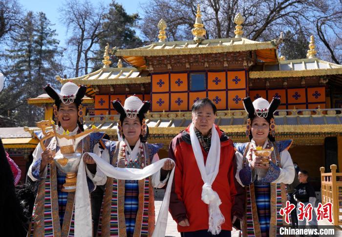 圖為歡迎儀式現(xiàn)場(chǎng),香港游客在羅布林卡與工作人員合影留念。中新社記者 李林 攝