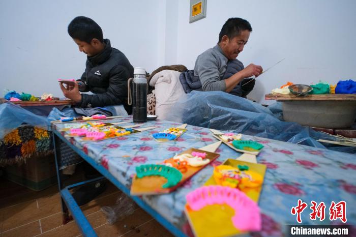 2月20日,來自日喀則仁布縣康雄鄉(xiāng)的次旺(右)和小兒子土旦桑布捏制酥油花。中新社記者 江飛波 攝