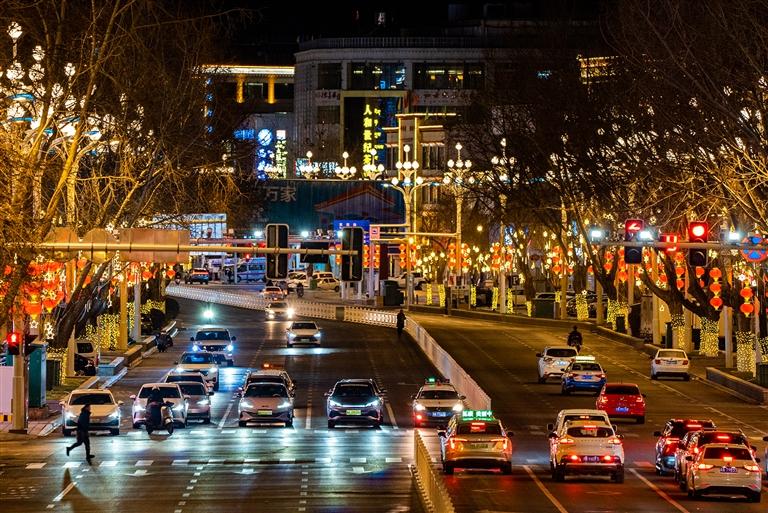 漫步在林廓東路北段、民族南路、北京中路……大街小巷都披上了藏歷新年的盛裝,新年元素琳瑯滿目,處處洋溢著節(jié)日的氣息。夜幕降臨,華燈初上,道路兩側(cè)樹上的燈籠和燈串開啟亮燈模式,街道在燈光的交相輝映下,傳遞出濃郁的年味,流光溢彩的街景也讓拉薩更顯活力,不時有人用手機(jī)定格此刻的畫面。