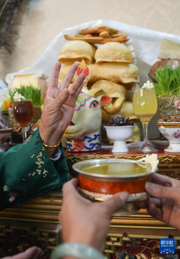 2月28日,身著藏裝的拉薩市民在敬獻(xiàn)青稞酒。新華社記者 晉美多吉 攝??