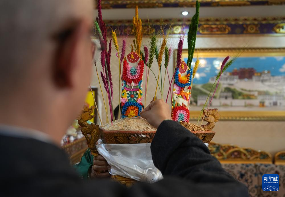 2月28日,身著藏裝的拉薩市民在吃寓意五谷豐登的“切瑪”。新華社記者 晉美多吉 攝??