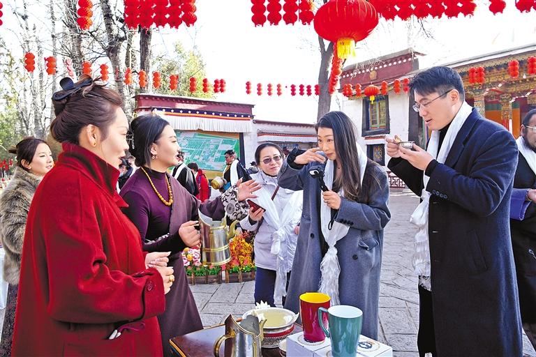 隨著一聲聲“扎西德勒!”“新年快樂!”的祝福語響起,身著盛裝的工作人員站在切瑪盒旁邊,熱情地教游客吃“切瑪”。“切瑪”盒里滿滿的青稞粒和糌粑,再加上金燦燦的酥油花和染成紅綠兩色的“羅薩梅朵”麥穗的裝點,象征著五谷豐登、福澤綿長。來自廣東的游客張女士一家是專程趕來過藏歷新年的,想來體驗不同年味兒的她輕捏一撮切瑪撒向空中:“愿我們?nèi)医】灯桨玻沧W鎳睒s昌盛!”