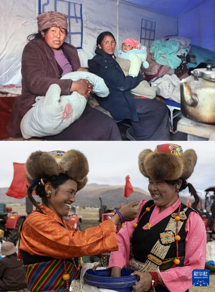 拼版照片:上圖為西藏日喀則市定日縣發(fā)生6.8級(jí)地震后,拉孜縣曲下鎮(zhèn)土林村受災(zāi)群眾丹珍卓瑪(右)和吉拉在臨時(shí)搭建的救災(zāi)帳篷中(1月7日攝);下圖為3月16日,拉孜縣曲下鎮(zhèn)土林村村民丹珍卓瑪(左)和吉拉在春耕典禮上檢查青稞種子。新華社記者 姜帆 攝