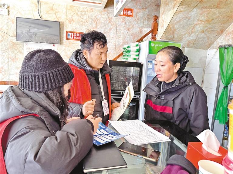 拉薩市城關(guān)區(qū)八一街道當(dāng)熱社區(qū)組織開展食品安全隱患排查工作。這是工作人員在仔細(xì)檢查商戶營業(yè)執(zhí)照、食品衛(wèi)生許可證和健康證等持證情況。 記者 王敏 攝