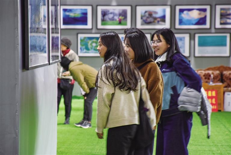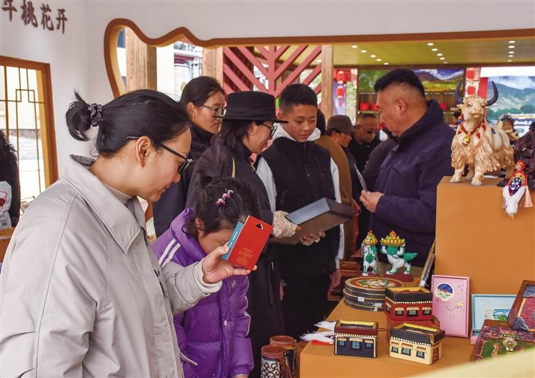 游客和市民群眾在文創(chuàng)產品展銷區(qū)參觀、選購特色產品。