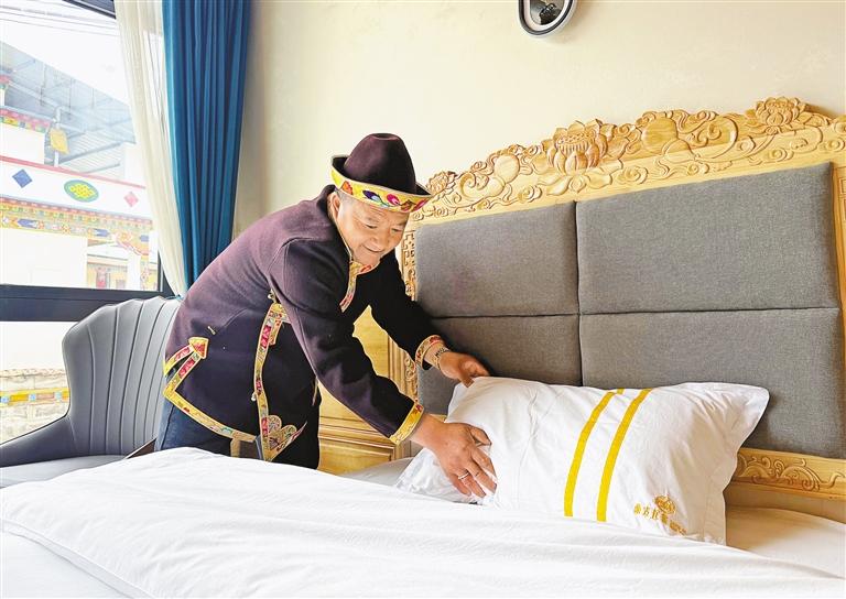 圖為扎西崗村民宿主人喬次仁在整理客房。記者 旦增蘭澤 攝